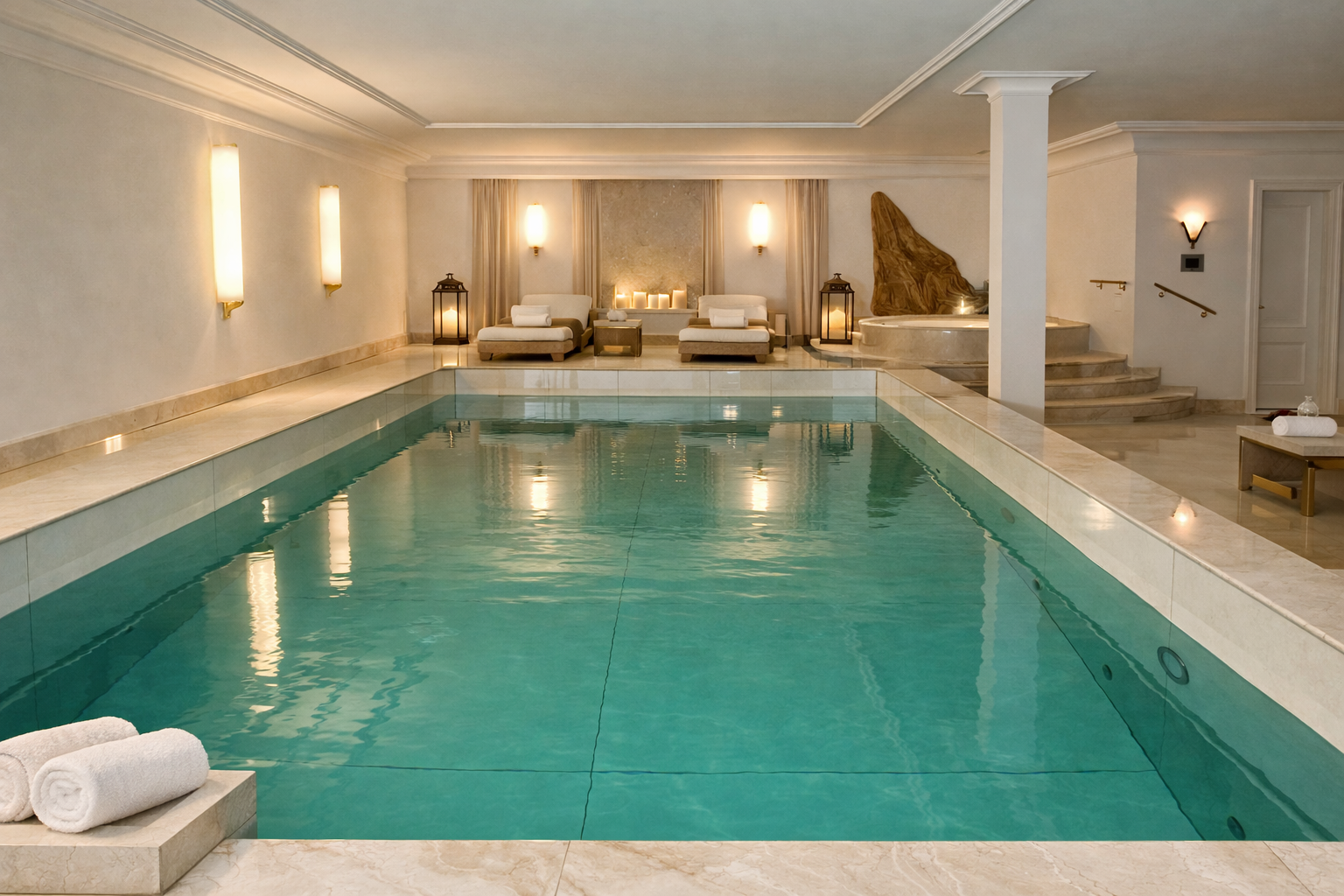 Einzigartig ist das Untergeschoss mit 200 m² Wellnessbereich: Indoor-Pool mit Gegenstromanlage, Jacuzzi, Sauna, Fitness, Massage, Lounge und geschützter Aussenbereich. Dazu Gästezimmer, Wirtschaftsraum, begehbarer Kühlraum und eine Tiefgarage mit Autolift für fünf Fahrzeuge. Technik- und Kellerräume befinden sich diskret im zweiten Untergeschoss.